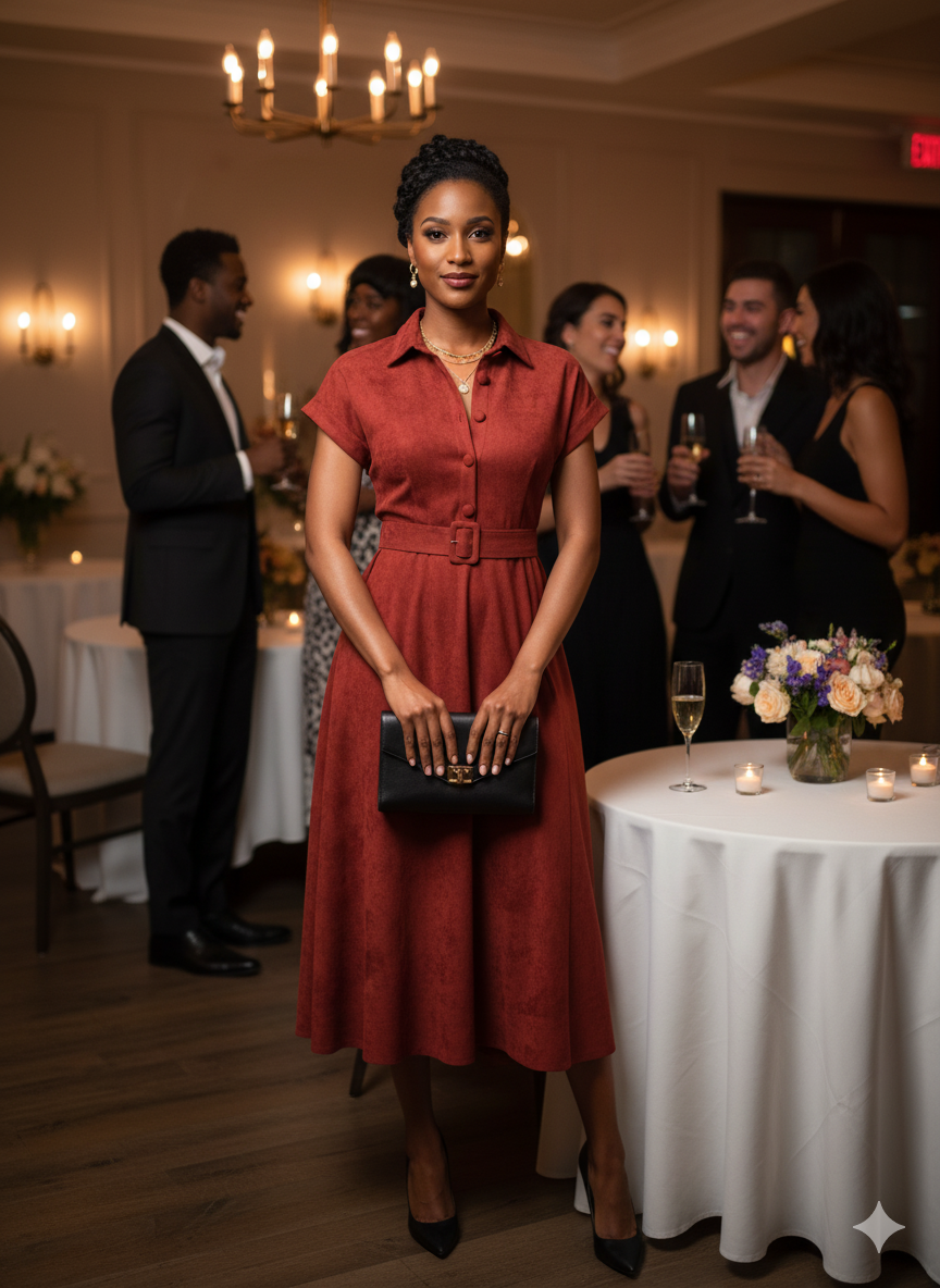 Step out in style with our Rust Velvet Affair, a luxurious short sleeve midi dress perfect for any outing or day at the office. Exude elegance and sophistication with this exquisite piece, perfect for any occasion.