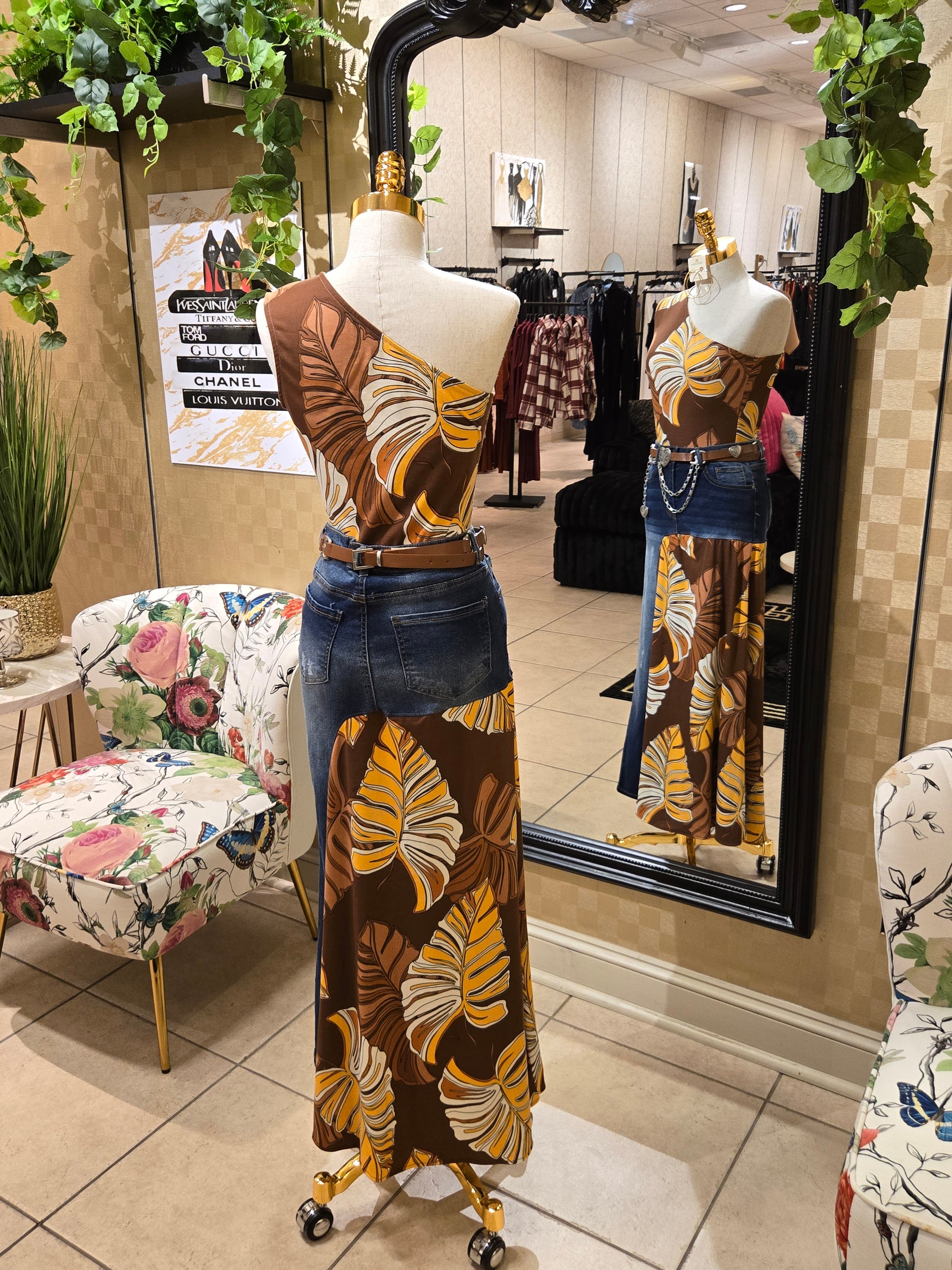 2pc Denim And Cotton skirt set. Featuring multi color brown asymetric shoulder body suit, and denim and cotton medi skirt. , perfectly urban sexy alluring, and fun outfit. Size small. Experience the perfect blend of urban sexiness and fun with our Urban Chic Denim Skirt Set. Featuring a multi-color asymmetrical shoulder bodysuit and a denim and cotton midi skirt, this 2-piece set is the ultimate outfit for any occasion. Available in size small, this set is sure to make you look and feel confident and alluring.
